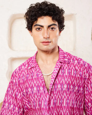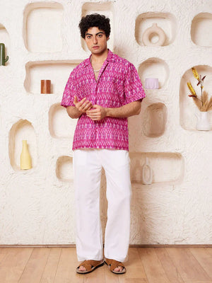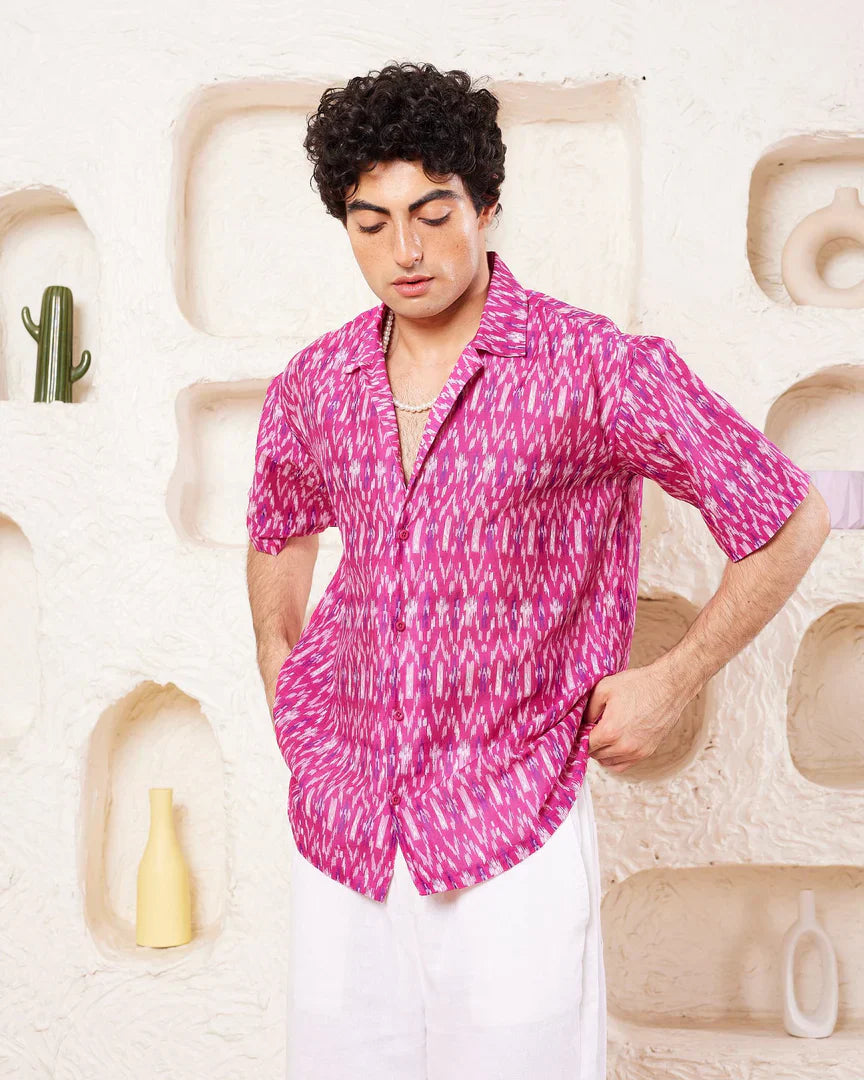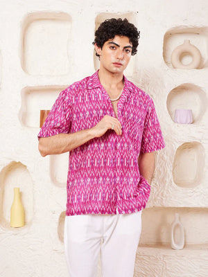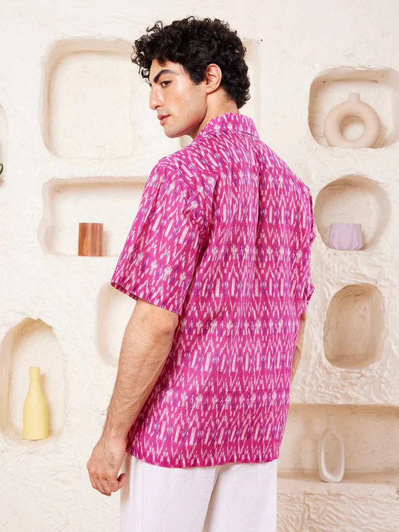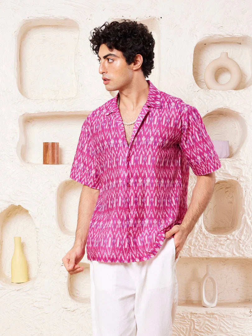 Printed shirt in cotton, has a spread collar, half sleeves, straight-cut hem with a button placket.
