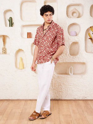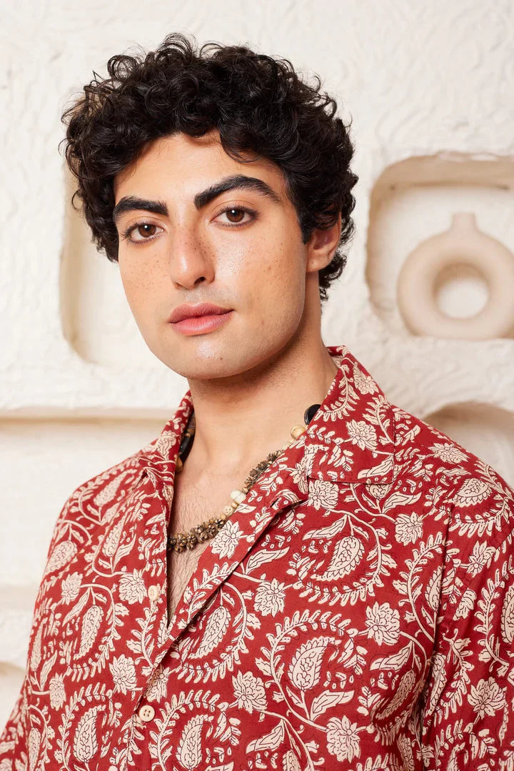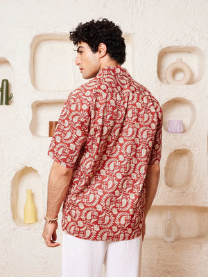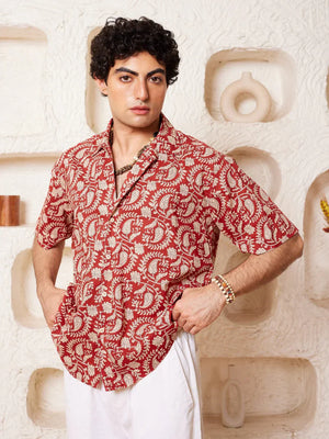 Printed shirt in cotton, has a spread collar, half sleeves, straight-cut hem with a button placket.