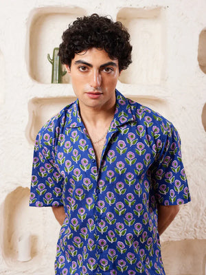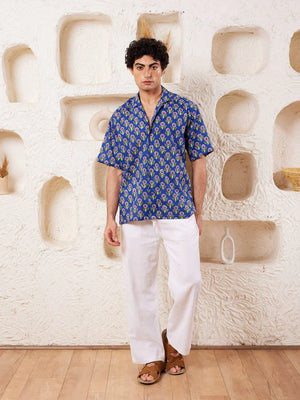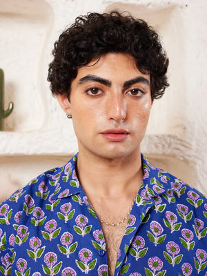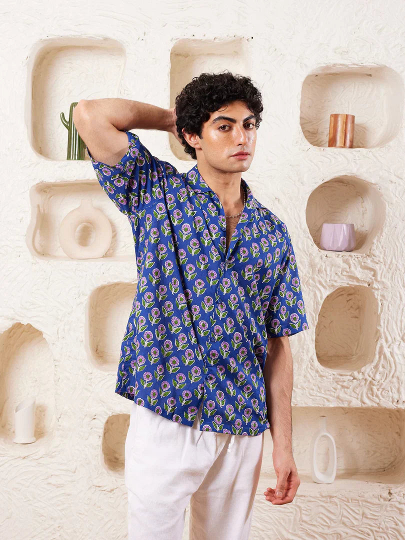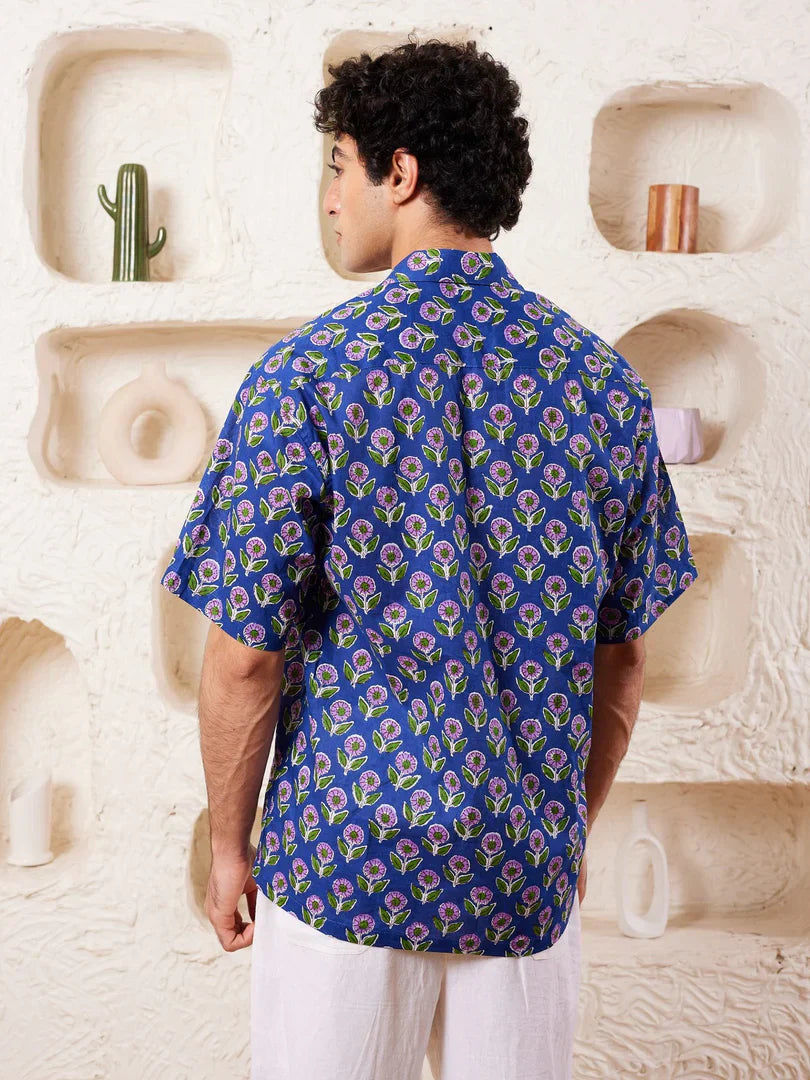 Printed shirt in cotton, has a spread collar, half sleeves, straight-cut hem with a button placket.